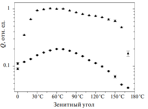 Примеры угловых характеристик (зависимости заряда Q сигнала фотоэлектронного умножителя, инициированного лазерной вспышкой, от угла поворота излучателя), измеренных для сферического и конусного излучателей, представлены на рис. 5. В диапазоне углов от 20° до 160° световой поток, формируемый коническим излучателем, превышает поток от сферического излучателя примерно в пять раз. При очевидном преимуществе конического излучателя перед сферическим в величине светового потока первый не лишен некоторых недостатков. Основным из них является необходимость прецизионной юстировки положения светового пятна от лазерного источника по отношению к вершине отражающего конуса для обеспечения азимутальной симметрии потока излучения.
