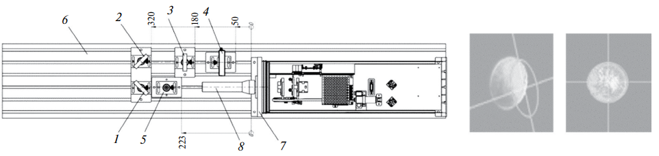 Рис. 6. Схема стенда для юстировки лазера (слева): 1 — отводная пластина, 2 —металлическое зеркало, 3 — собирающая линза, 4 — камера, 5 — вспомогательный держатель, 6 — плита из алюминиевого профиля, 7 — лазерный источник, 8 — световод. Примеры изображения пучка на срезе световода до и после юстировки (справа).