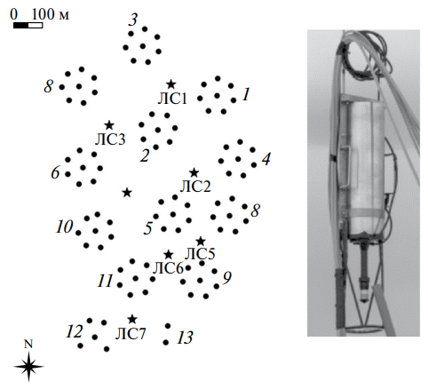 Начало развертывания ЛКС установки Baikal-GVD относится к 2017 году, к моменту ввода в эксплуатацию второго кластера. Сейчас в состав ЛКС входит 7 лазерных станций (ЛС), обеспечивающих калибровку всех двенадцати кластеров телескопа. Размещение ЛС относительно кластеров показано на рис. 7. Состав и основные характеристики ЛС представлены в табл. 2.