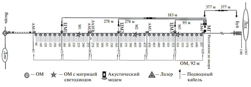 Лазерный калибровочный источник света размещается на глубине около 270 м от якоря и подключается к ЦМ2. Смещение лазера от центра гирлянды в направлении дна озера обусловлено тем, что фотокатоды фотоэлектронных умножителей оптических модулей ориентированы в нижнем направлении. Чтобы унифицировать системы управления лазером и АМ, была модернизирована плата управления и электропитания лазера. В частности, интерфейс канала управления лазером Ethernet был заменен на RS485. Это позволило использовать в ЦМ2 системы электропитания (24 В) и управления лазера (COM Server c интерфейсом RS485), полностью идентичные ЦМ1 и ЦМ3. ЛС6 и ЛС7 собраны в соответствии с представленной схемой и содержат по одному лазеру. В то же время в представленной конфигурации предусмотрена возможность установки на гирлянде до двух лазерных источников света, подключенных к ЦМ2. Использование интерфейса RS485, рассчитанного на передачу данных на расстояния более километра, и источника питания лазера с широким диапазоном входных напряжений (от 9 до 36 В) снимают ограничение на выбор месторасположения лазерного источника на гирлянде.