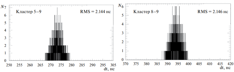 Помимо межкластерной временной калибровки, функцией ЛКС является контроль точности временной синхронизации кластеров [7]. В качестве параметра, характеризующего точность синхронизации, используется величина dt – среднеквадратичный разброс (RMS) разницы времен срабатываний каналов, расположенных на разных кластерах. Примеры распределений событий по величине dt, измеренных при проведении серий лазерных измерений на ЛС5, представлены для кластеров 5, 8 и 9 на рис. 10. Точность временной синхронизации составила 2.1 нс. Эта величина определяется дискретностью времени фиксации триггерных сигналов (5 нс) и хорошо совпадает с ожидаемым значением.
