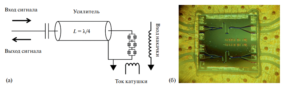 Рис. 1. Дизайн образца усилителя на контакте Джозефсона: а – принципиальная схема усилителя состоит из четвертьволнового резонатора и трех СКВИДов, сигнал и накачка подаются через два независимых канала; б – фотография образца с двумя схемами усилителя в экспериментальной установке. Размер чипа 4 × 4 мм2. Вход сигнала – слева, вход накачки – справа.