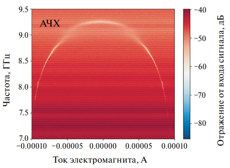 Измеренные зависимости резонансной частоты усилителя от тока в управляющем соленоиде представлены на рис. 3. Данные получены как серии амплитудно-частотных характеристик (АЧХ) схемы, измеренных при разных значениях тока в соленоиде. Ширина и интенсивность линии на плоскости АЧХ говорят о силе связи резонатора в схеме усилителя с источником сигнала. Исследованный образец имеет полосу перестройки от 7 ГГц до 9.2 ГГц и потенциально может усиливать в этом диапазоне, однако размытие отклика на АЧХ в полосе 8.5–9.2 ГГц может указывать на неоптимальную связь резонатора с источником сигнала в этом поддиапазоне.
