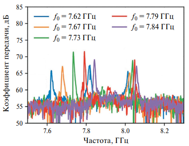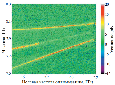 Измеренные частотные зависимости усиления ДПУ для каждой целевой частоты оптимизации представлены на рис. 6. При измерениях использовались оптимальные параметры режима из рис. 5. Для каждой частоты оптимизации наблюдаются два максимума усиления (в полосе сигнала и в зеркальной), характерные для невырожденного параметрического усилителя. Усиление более 15 дБ наблюдается на выбранной для оптимизации частоте (нижняя красная полоска), а также на зеркальной частоте (верхняя красная полоска). Частота накачки лежит между нижней и верхней полосами усиления (средняя линия). Разница между частотой накачки и полосами усиления достигает 200 МГц, что достаточно для частотного разделения каналов сигнала и накачки.