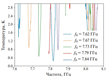 Рис. 8. Результат измерения эквивалентной шумовой температуры цепи, состоящей из ДПУ и усилителя на транзисторе с высокой подвижностью электронов. Целевая частота сигнала для оптимизации – f0 .