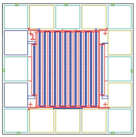 Чип размером 7 × 7 мм2 представляет собой 16 контактных площадок, между которыми расположены цепочки из ячеек различной длины: справа и слева короткие линии по 50 ячеек в каждой, посередине – длинная линия с 1000 ячеек. Кроме того, снизу чипа расположен одиночный СКВИД, чтобы обеспечить возможность его отдельного измерения. Таким образом, в каждом чипе находится более 6000 переходов.