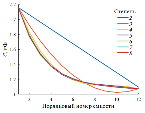На рис. 5 приведены зависимости функции распределения емкостей конденсаторов от их порядкового номера для различных степеней полинома Бернштейна. Из приведенных кривых следует, что минимальной степенью многочлена для восстановления распределения является значение, равное 5. Увеличение степени полинома свыше 5 не приведет к качественному изменению характера формы, но увеличит расчетное время.