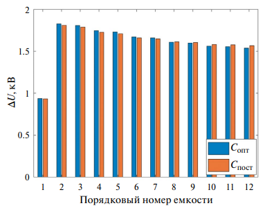 На рис. 7а приведены расчетные осциллограммы выходных напряжений для случаев постоянного и оптимизированного распределений емкостей, отражена суммарная электрическая энергия (рис. 7б), запасенная в емкостях устройства, а также приведен уровень пульсации для двух расчетных случаев.