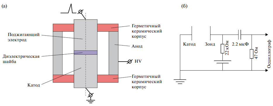 Рис. 1. Принципиальная конструкция компактного управляемого вакуумного разрядника (а) и электрическая схема зондовых измерений (б).