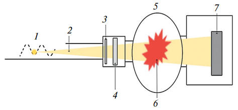 Рис. 1. Схема эксперимента по изучению быстропротекающих процессов на пучке СИ: 1 – источник СИ, 2 – белый пучок СИ, 3 – быстрый затвор, 4 – коллиматор, 5 – взрывная камера, 6 – взрывающийся образец, 7 – детектор.