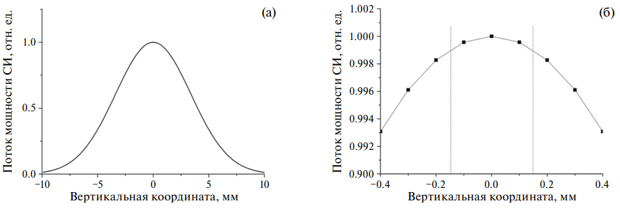 Рис. 2. Зависимость плотности мощности в пучке СИ от вертикальной координаты на станции “Экстремальное состояние вещества” на ВЭПП-4М. Энергия пучка электронов в накопителе 4.5 ГэВ, расстояние от источника 43 м: а – весь пучок СИ; б – центральная часть пучка, пунктирными линиями обозначены границы, где поток мощности уменьшается на 0.001 относительно максимума.