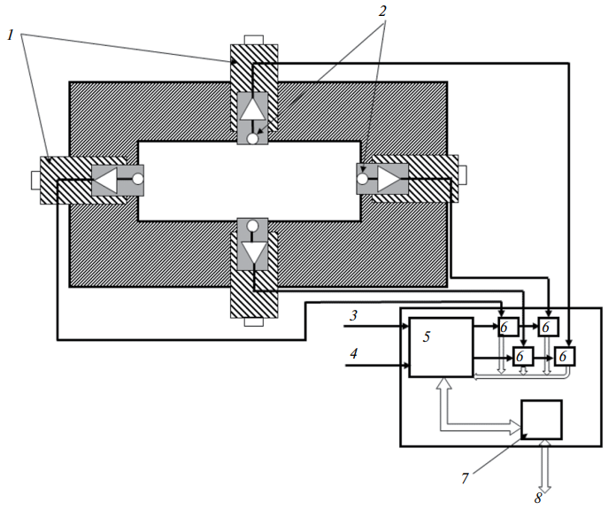 Рис. 3. Блок-схема быстрого монитора положения и интенсивности пучка СИ: 1 – линейные трансляторы 2 – фотодетекторы 3 – синхронизация СКИФ 4 – запуск детектора 5 – ПЛИС 6 – АЦП 7 – интерфейс Ethernet 8 – связь с управляющим компьютером.