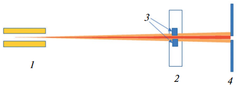 Рис. 4. Схема расположения монитора пучка СИ: 1 – вигглер 2 – монитор положения пучка СИ 3 – сенсоры монитора положения пучка СИ 4 – основной коллиматор.