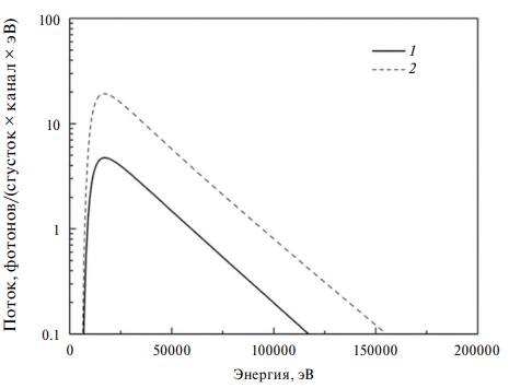 Рис. 5. Спектры синхротронного излучения на станции “Быстропротекающие процессы” ЦКП СКИФ (кривая 1) и на станции “Экстремальное состояние вещества” на ВЭПП-4М (кривая 2). СКИФ – энергия пучка 3 ГэВ, ток 5 мА в сгустке, вигглер – 40 полюсов 4.2 Тл, расстояние до детектора 100 м. ВЭПП-4М – энергия пучка 4.5 ГэВ, ток 10 мА в сгустке, вигглер 9 полюсов (2 полюса 1.2 Тл, 7 полюсов 2 Тл), расстояние до детектора 43 м. Материалы в канале – 6.7 мм Ве и 2 м воздуха. Площадь канала детектора 0.5 × 0.05 мм2.