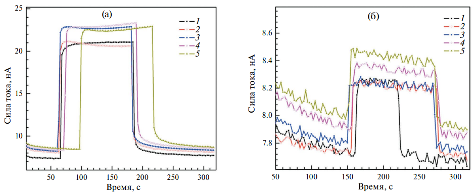 Рис. 7. Величина фототока при облучении сапфировых сенсоров, диаметр облучаемой области 25 мм (а) и 5 мм (б). Пластина сапфира имеет толщину 150 мкм. Напряжение на сенсоре 500 В, ток трубки 500 мкА: 1 – центр пластины, 2 – 10 мм выше от центра, 3 – 10 мм справа от центра, 4 – 10 мм ниже от центра, 5 – 10 мм слева от центра.