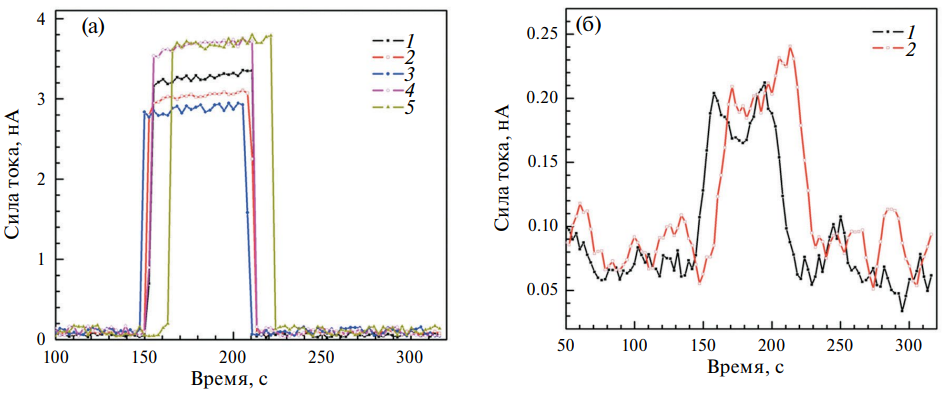 Рис. 6. Величина фототока при облучении SiC-сенсоров, диаметр облучаемой области 25 мм (а) и 5 мм (б). Пластина SiC имеет толщину 320 мкм. Напряжение на сенсоре 500 В, ток трубки 500 мкА: 1 – центр пластины, 2 – 10 мм выше от центра, 3 – 10 мм справа от центра, 4 – 10 мм ниже от центра, 5 – 10 мм слева от центра.