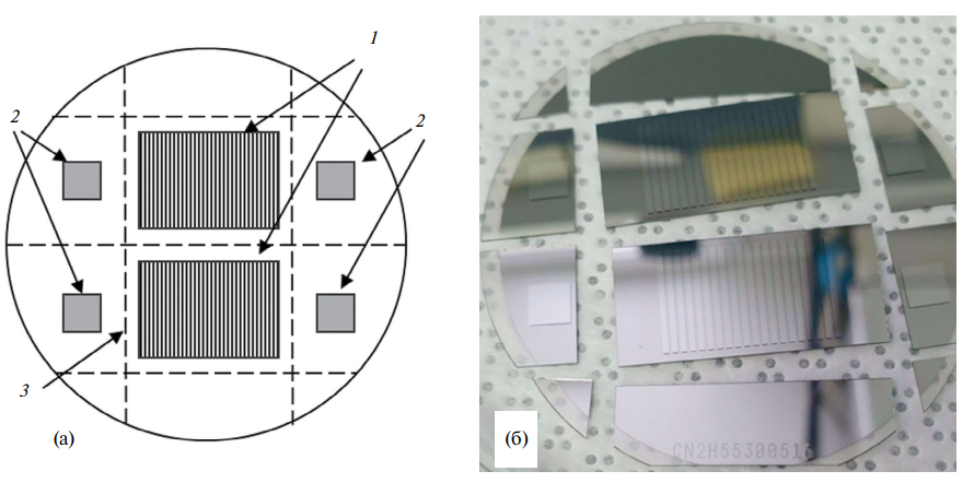 Рис. 8. a – Схема расположения сенсоров на пластине: 1 – микрополосковые сенсоры, 2 – pad-сенсоры, 3 – линии разреза; б – фотография пластины карбида кремния с микрополосковыми и pad-сенсорами.