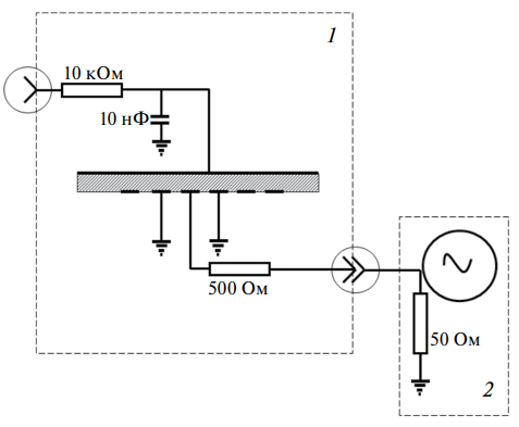 Рис. 9. Схема присоединения сенсора из лейкосапфира или карбида кремния к источнику высокого напряжения и к осциллографу: 1 – корпус сенсора, 2 – осциллограф.