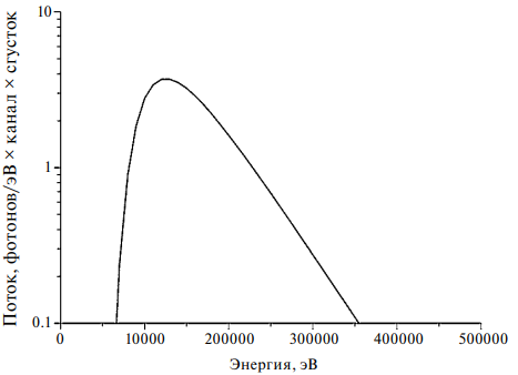 Гасящий резистор, включенный последовательно с сенсором, необходим для подавления колебательного переходного процесса, возникающего после импульса тока от вспышки СИ из-за паразитной индуктивности и достаточно большой емкости сенсора. Измерения проводились на станции “Субмикросекундная диагностика” Сибирского центра синхротронного и терагерцевого излучения ИЯФ СО РАН на накопителе ВЭПП-3. Облучение проводилось белым пучком СИ, который в сечении имеет форму прямоугольника 0.9 × 20 мм2. Размер области облучения в одном направлении ограничивался размером пучка 0.9 мм, а в другом направлении – длиной полоски 1.2 мм. Площадь облучения составляла 0.9 × 12 мм2. Плоскость сенсора перпендикулярна плоскости пучка СИ, полоски расположены параллельно пучку, облучалась только одна полоска, подключенная к осциллографу. Для измерений использовался осциллограф Keysight DSOS054A с полосой пропускания 500 МГц. На рис. 10 показан спектр излучения в белом пучке СИ из 2Т-шифтера ВЭПП-3, рассчитанный с помощью программы XOP2.3.