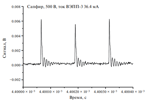Рис. 12. Сигнал от вспышек СИ с сенсора из лейкосапфира с гасящим резистором 500 Ом. Напряжение на сенсоре 500 В, ток в меньшем сгустке 29.3 мА.
