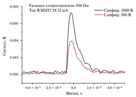 Из сравнения рис. 14, 13 следует, что сигнал от сенсора из карбида кремния существенно быстрее, чем сигнал от сенсора из лейкосапфира. Длительность переднего фронта сигнала от лейкосапфира равна примерно 5 нс, тогда как для карбида кремния эта величина составляет около 2 нс. В последнем случае нужно учесть возможное влияние полосы пропускания осциллографа 500 МГц, так что длительность переднего фронта в случае карбида кремния может быть меньше 2 нс. Длительность заднего фронта для сенсора из карбида кремния равна 10 нс, тогда как для сапфира эта величина составляет более 20 нс. Следует отметить, что различие временных характеристик сигналов от двух сенсоров, по-видимому, связано с различием в емкости полоски, подключенной к измерительной цепи. Действительно, толщина сенсора из лейкосапфира в 2.1 раза меньше, чем толщина сенсора из карбида кремния, а диэлектрическая проницаемость лейкосапфира на 15% больше, чем у карбида кремния. Это приводит к тому, что емкость полоски в случае лейкосапфира в 2.5 раза выше, чем для карбида кремния.