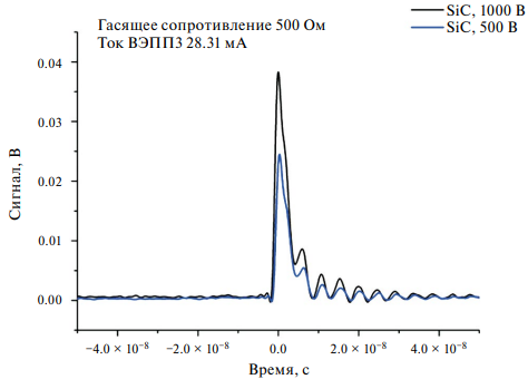 На рис. 13 видно, что с увеличением напряжения на сенсоре форма сигнала не меняется, а его величина растет. Результаты аналогичных измерений для сенсора из карбида кремния приведены на рис. 14.