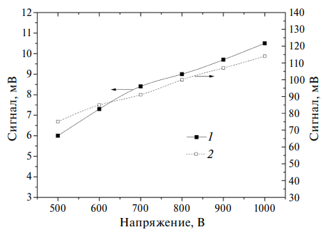 Зависимость величины сигнала от полоски сенсора из лейкосапфира и карбида кремния от напряжения на сенсоре приведена на рис. 15. Зависимости для двух материалов сенсора ведут себя практически одинаково, при этом отношение величин сигнала в пике равно примерно 12.