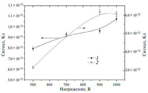 Рис. 16. Зависимость полного заряда, образующегося в сенсоре из лейкосапфира (кривая 1, левая шкала) и карбида кремния (кривая 2, правая шкала), от напряжения на сенсоре.