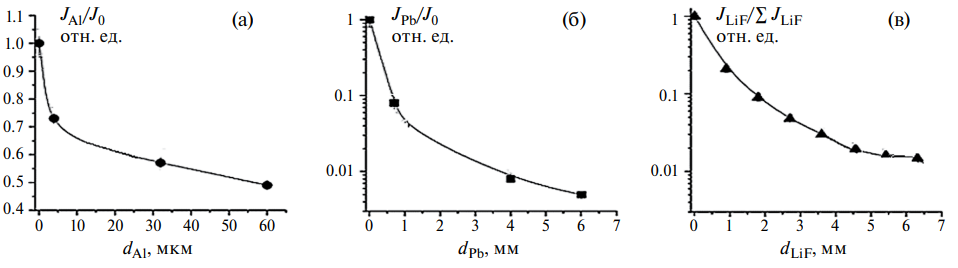В первом канале термолюминесцентные детекторы LiF(Mg, Ti) выполняли одновременно роль фильтров для измерения кривой ослабления. Алгоритм, используемый для построения кривой ослабления на рис. 3в, детально описан в работе [17–19]. Кривая ослабления строилась по показаниям термолюминесцентных детекторов с учетом их толщины. Первая точка на кривой ослабления соответствует суммарному сигналу со всех термолюминесцентных детекторов ∑JLiF при толщине поглощения равной нулю. Вторая точка на кривой ослабления соответствует суммарному сигналу со всех термолюминесцентных детекторов за вычетом сигнала с первого детектора, толщина которого в данном случае является толщиной ослабления. Третья точка на кривой ослабления соответствует суммарному сигналу со всех термолюминесцентных детекторов за вычетом сигналов первых двух детекторов и т. д. Таким образом строилась кривая ослабления JLiF /∑JLiF (рис. 3в).