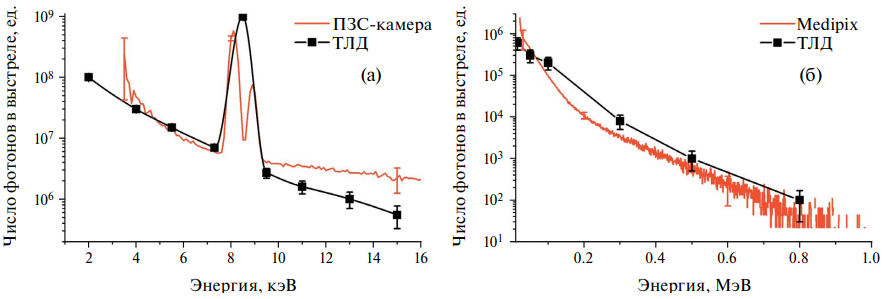 На рис. 4 приведены спектры, восстановленные по методу эффективных энергий и нормированные на полный телесный угол спектры с помощью спектрометра на основе детекторов LiF(Mg, Ti) (выделены черным цветом). В силу невысокой разрешающей способности не удается различить отдельно пики Кα- и Кβ-линий. Тем не менее всплеск показаний, соответствующий характеристическим квантам, восстанавливается достаточно достоверно, интегральный поток квантов линий К-серии достигает 109, что разумно согласуется с данными ПЗС-матрицы. В области высоких энергий спектр тянется до почти 800 кэВ согласно показаниями ТЛД, что соответствует данным полупроводникового детектора. Оценка температуры горячих электронов в плазме составляет около 100 ± 20 эВ при коэффициенте преобразования в рентгеновские кванты около 0.5% в области до 1 МэВ. Далее уровень сигнала уже слабо отличим от уровня шума в силу экспоненциального характера спада распределения квантов по энергиям.