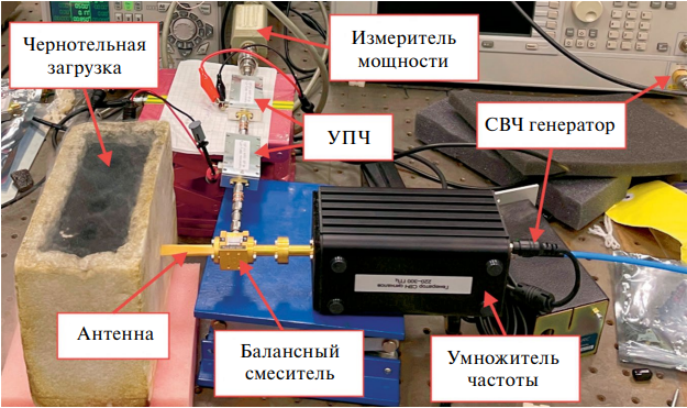 В качестве задающего генератора опорного СВЧ-сигнала для умножителя частоты на 18 (модуля расширения частотного диапазона МВЭЙВ 220–330 ГГц) в канале гетеродина использовался генератор HP 83623B, частота которого устанавливалась равной f = 230/18 ГГц (около 12.8 ГГц) при уровне выходной мощности Pref = 7 дБм. В тракте ПЧ на выходе смесителя использовались МШУ МВЭЙВ 10 МГц –4 ГГц с коэффициентом шума 0.6 дБ и коэффициентом усиления 40 дБ.