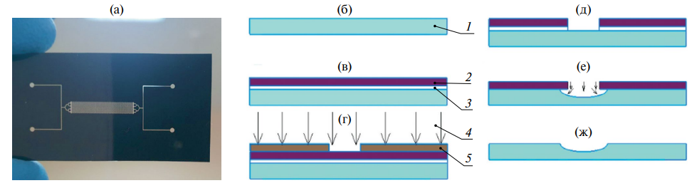 Рис. 1. Процесс формирования микроструктуры в стеклянной подложке: а – фотошаблон; б – чистая стеклянная поверхность (1 – стекло); в – заготовка микрочипа (2 – фоторезист, 3 – усилитель адгезии); г – экспонирование фоторезиста через фотошаблон (4 – УФ-излучение, 5 – фотошаблон); д – проявление фоторезиста; е – травление подложки; ж – снятие слоя фоторезиста.