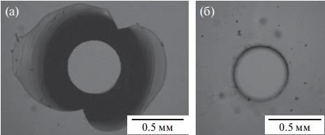 Рис. 2. Выходные отверстия на поверхности стекла при воздушном зазоре (а), при использовании жидкости (б).