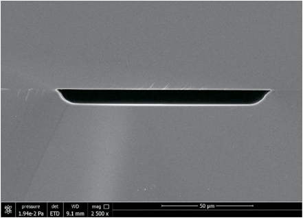 После успешной склейки (рис. 3б) проводилась оценка высоты микроканалов при помощи спектрофотометра HR2000+CG-UV-NIR (Ocean Optics, USA). В результате была получена сравнительная зависимость глубины травления стекла от времени воздействия кислотного раствора с различной концентрацией (рис. 4). Из графика видно, что для 10%го раствора при травлении в течение 15 мин и 20 мин глубина травления одинакова. Вероятнее всего, это связано с тем, что после 15-й минуты слой нерастворимых продуктов реакции приводит к существенному снижению скорости травления. При увеличении времени травления ухудшается адгезия фоторезиста с подложкой, это приводит к неконтролируемому травлению поверхности подложки под фоторезистом. По результатам экспериментов были выбраны оптимальный состав и режим травления: 5-процентный раствор, травление в течение 15 мин. На рис. 5 показано поперечное сечение канала, полученное на растровом электронном микроскопе (РЭМ). Хорошо видно, что глубина канала однородна по всей ширине, а боковые стенки наклонены к плоскости канала под близким к 45° углом, обусловленным тем, что травление происходит изотропно, т. е. часть стеклянной подложки вытравливается под слоем фоторезиста.