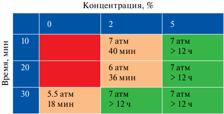 Для оценки прочности склеивания микрофлюидного чипа была собрана экспериментальная установка, состоящая из воздушного компрессора и контроллера давления. Прочность склеивания стеклянных подложек оценивалась путем прикладывания давления воздуха к одному из входных каналов, при этом все остальные были заблокированы. Микрофлюидный чип помещался в емкость, наполненную водой, для наглядной регистрации утечки воздуха. Давление постепенно повышалось с шагом 50 кПа каждые 2 минуты, когда оно становилось достаточно высоким, чтобы разрушить соединение стекла, в чашке с водой наблюдалась утечка воздуха. Его значение непосредственно перед утечкой определялось как характеристика прочности склейки. Тестирование проводилось при давлениях до 700 кПа. Стабильность чипа в указанном диапазоне достаточна для проведения микрофлюидных экспериментов с использованием типичного микрофлюидного оборудования. На рис. 6 представлены результаты экспериментов по оценке влияния времени активации поверхности стеклянных пластин и концентрации детергента на прочность склейки. В ходе испытаний чипы, обработанные в чистой воде (концентрация детергента 0%) при времени обработки 30 мин и 2-процентном растворе при времени обработки 10 и 20 мин, расклеились, достигнув давления 600 и 700 кПа. Однако чипы, склеенные в 2-процентном растворе при времени обработки 30 мин и в 5-процентном растворе при времени обработки 10 мин, 20 мин и 30 мин, достигнув давления в 700 кПа, не расклеились. По результатам экспериментов были выбраны оптимальная концентрация (5%) и продолжительность обработки (15 мин).