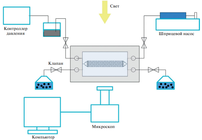 Установка для исследования микрофлюидных потоков собрана на базе оптического микроскопа Olympus IX71 (Olympus, Japan) (рис. 7), сопряженного с камерой Infinity 2 (Lumenera, USA). Управление потоками в микрофлюидном чипе проводилось с помощью контроллера давления VSO-BT (Parker, USA) и шприцевого насоса 200-CE (Cole Parmer, USA). Потоки жидкостей в микрофлюидном чипе могут стимулироваться как при постоянном перепаде давления с помощью контролера давления, так и при постоянном объемном расходе с помощью шприцевого насоса. Также на рис. 7 показаны емкости для сбора флюидов, вытесняемых из чипа.