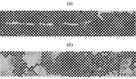 На рис. 10 приведены результаты экспериментов по вытеснению гептана водой в микрофлюидных чипах с гидрофильной (рис. 10а) и гидрофобной (рис. 10б) смачиваемостью поверхности каналов. Темные области на изображениях соответствуют водной фазе, а светлые – углеводородной. Остаточная насыщенность углеводородом гидрофильного чипа имеет величину менее 8.5% (см. рис. 10а), т. е. вода почти полностью вытесняет гептан. В случае гидрофобного чипа результат выглядит иначе. После вытеснения в пористой среде остаются большие кластеры углеводородной фазы, которые были удержаны за счет действия капиллярных сил. Уточним, что капиллярные силы в данном случае препятствуют вытеснению углеводорода. Остаточная доля углеводорода составила около 20%.