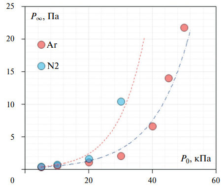 Расход газа G прямо пропорционален произведению давления торможения P0 на квадрат диаметра критического (звукового) сечения сопла d*. При ограниченной мощности вакуумных откачных средств увеличение давления торможения требует уменьшения критического диаметра сопла. Поскольку уменьшение размеров сопел имеет свои технические пределы, а при миниатюризации сверхзвуковых сопел к тому же обостряются проблемы воспроизведения геометрии внутреннего канала, а также шероховатости поверхности, параметры режимов стационарного истечения ограничены. Попытки увеличения расхода рабочих газов требуют непропорционально быстрого роста производительности откачных средств и, соответственно, стоимости выполняемых работ. Так, при стационарном истечении газа максимальная производительность системы вакуумирования газодинамического стенда ЛЭМПУС2 [5], используемого в настоящей работе, ограничивается условием его безопасного режима функционирования, который реализуется при давлении в камере расширения, не превышающем 20 Па. Этот предел проиллюстрирован на рис. 1 при истечении газа из звукового сопла диаметром 1.12 мм. При достижении давления торможения 40–50 кПа (в зависимости от вида газа) дальнейшее увеличение давления в форкамере ведет к стремительному росту фонового давления, не позволяя увеличивать расход.