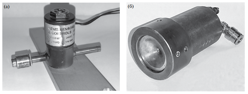 При решении поставленной задачи перед экспериментатором возникает соблазн использовать промышленные газовые клапаны. В контексте настоящей работы был осуществлен поиск и анализ устройств, пригодных для работы в вакууме, из большого перечня, имеющегося в публикациях. Удовлетворяющими условиям работы в вакууме и доступными для приобретения оказались промышленные клапаны “секундного” диапазона, из которых наиболее подходящим по характеристикам под задачи исследования подошел вакуумный клапан GEMS SENSORS & CONTROLS A2013 S197 VAC [8]: время срабатывания (быстродействие) – 9 мс, двухпозиционный, нормально закрытый, с низким потреблением (примерно 1.5 Вт, при напряжении питания 24 В), с проходным отверстием 1/6" (4.23 мм). Клапан предназначен для работы с нейтральными газами и жидкостями. Рабочее давление 0–20.68 бар (0–300 PSI). Клапан изготовлен из нержавеющей стали и рекомендован для работы в диапазоне рабочих температур 0–80°C. Фотография клапана приведена на рис. 2а.