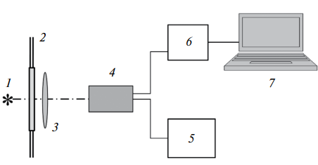 Рис. 4. Оптическая схема регистрации импульсов люминесценции струи газа:1 – инициированное свечение частиц газа, 2 – окно камеры расширения, 3 – линза, 4 – ФЭУ- 92 (или спектрометр Ocean Optics USB4000), 5 – блок питания ФЭУ, 6 – АЦП USB3000, 7 – компьютер.