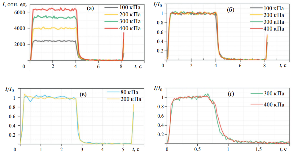 На рис. 5 приведены результаты детектирования импульсных струй, формируемых медленным клапаном при истечении аргона из сопел диаметрами 0.3 и 0.7 мм. Газовые импульсы при длительностях tи от 1.0 с до 4.0 с имеют форму трапеции с выраженной плоской вершиной (рис. 5а). Параметры импульсов не зависят от давления, что подтверждают зависимости от времени tи, нормированные к единице в максимуме, при всех использованных длительностях (рис. 5б–г). Длительность фронта импульсов не превышает 0.15 с, длительность спада 0.25 с. Наличие сформированной протяженной плоской вершины газового импульса, начиная с длительностей, превышающих 0.5–0.7 с, можно считать признаком формирования квазистационарного ядра импульсного газового потока.