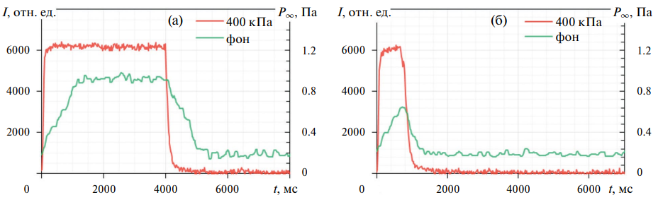 Рис. 6. Профиль изменения интенсивности излучения газового импульса и изменения фонового давления в камере расширения P∞, d* = 0.3 мм: а – tи = 4000 мс, Q = 2; б – tи = 700 мс, Q = 10.