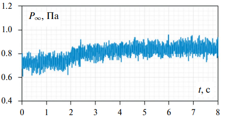 Однако, как показано в работах [16, 17], область квазистационарного истечения уменьшается вниз по потоку, ограничивая возможности моделирования. Кроме того, при включении клапана в режиме многократных циклов требуется некоторое время для установления уровня фонового давления, тем большее, чем выше расход газа в сопле. Экспериментально установлено, что в режимах со временем открытия клапана 1 мс при скважности 100 и частоте повторения импульсов 10 Гц даже при высоких расходах газа давление окружающего пространства стабилизируется через 3–5 с работы клапана (рис. 8). Это происходит после незначительного (примерно 15-процентного) роста над начальным, в отсутствие истечения газа, значением. В дальнейшем это давление не подвержено изменению. Поэтому несколько первых циклов включения – выключения клапана следует вынужденно отбраковывать в связи с меняющимся уровнем фонового давления. Таким образом, необходимо выбирать условия, когда период стационарного истечения достаточен для регистрации искомых параметров потока. Как показали испытания, длительность импульса порядка 1 мс оказалась оптимальной для моделирования.