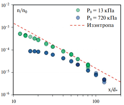 Как и следовало ожидать, при низком уровне давления торможения, т. е. в отсутствие конденсации, данные совпали с изэнтропической зависимостью, за исключением начального участка, где возможен процесс столкновительного гашения флуоресценции. При высоком давлении торможения результаты вследствие конденсации регистрируются существенно ниже изэнтропической зависимости, рассчитанной по модели [15]. Тем не менее, хорошее совпадение с изэнтропической зависимостью в данных проверочных режимах нельзя считать полностью достоверным вследствие достаточно сложной процедуры тарировки для получения абсолютных значений плотности. В то же время, наклон зависимостей, близкий к изэнтропическому, убеждает авторов в возможности моделирования стационарных процессов с помощью “быстрой” импульсной системы.