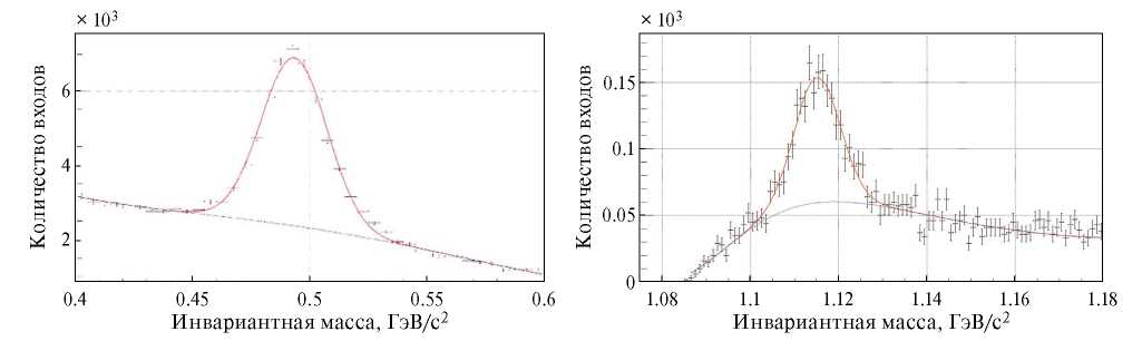 Для демонстрации работы трековой системы на рис. 7 представлены массовые спектры зарегистрированных на части набранной в осеннем сеансе 2021 г. статистике Kₛ⁰-мезонов и Λ-гиперонов. Масса восстановленного Λ-гиперона составила 1115.9 МэВ/c2, а ширина (σ) распределения по массе Λ-гиперонов составляет 4.8 МэВ/c2, ширина (σ) распределения по массе Kₛ⁰-мезонов — 12.3 МэВ/c2.