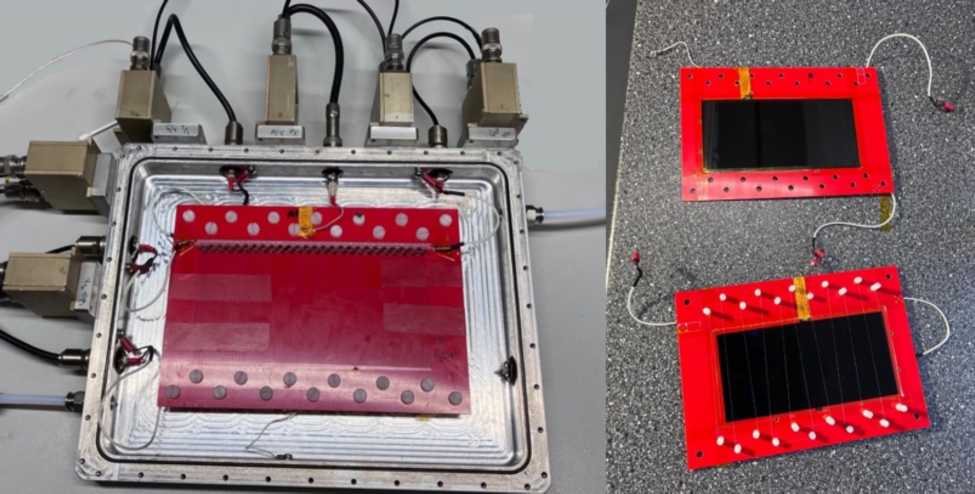 Архитектура и конструкционные материалы подробно описаны в [9]. На рис. 3 справа представлены печатные платы, на которые полиамидным скотчем закреплены стекла-электроды, на обоих стеклах с внешней стороны от газового промежутка нанесена полупроводящая эмаль для формирования потенциала, потенциал на эмаль подается с медной полоски, соединенной с разъемом SHV кабелем МГТФ 0.5. На одной из плат располагаются отверстия, в которых закреплены пластиковые винты, они позволяют зафиксировать спейсеры в газовом промежутке и детектор в корпусе. На второй плате располагается стекло, на котором, помимо эмали, нанесена пленка 10В4С толщиной 2 мкм, располагающаяся непосредственно в газовом промежутке. После захвата ядром 10В нейтрона образуется составное ядро, которое распадается в соответствии с (1). В силу того, что продукты конвертации разлетаются в противоположных направлениях, в газовый промежуток выходит только одно из дочерних ядер. Это ядро вызывает рождение кластеров первичной ионизации (e–I), первый из которых появится непосредственно у поверхности конвертера. Для повышения надежности и эффективности регистрации путь электронов до ионизации делается равным ширине всего газового промежутка путем приложения на электрод без пленки-конвертера положительного потенциала. Движение электронов первичной ионизации под действием приложенного электрического поля будет вызывать вторичную ионизацию. Этот процесс носит лавинообразный характер и определяется в основном давлением газа, величиной напряженности поля и потенциалом ионизации молекул газа. Движение заряда лавины индуцирует сигнал на считывающие электроды-стрипы.