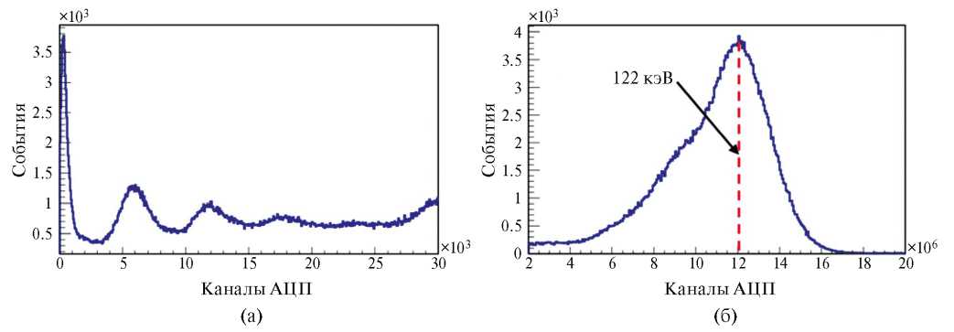 Амплитудная калибровка SiPM выполнялась по спектру шумовых сигналов SiPM, показанным на рис. 1а. Как видно, амплитудный спектр представляет собой набор пиков, соответствующим различному количеству фотоэлектронов. Расстояние между соседними пиками соответствует амплитуде одноэлектронного импульса и равно 6000 каналам АЦП. Спектр амплитуд от гамма-квантов источника ⁵⁷Co показан на рис. 1б. Легко видеть, что амплитуда сигнала с одной SiPM-матрицы соответствует 18 фотоэлектронам/кэВ, что эквивалентно 36 фотоэлектронам/кэВ для суммы сигналов с двух фотодетекторов, размещенных на противоположных гранях сцинтиллятора CsI(pure).
