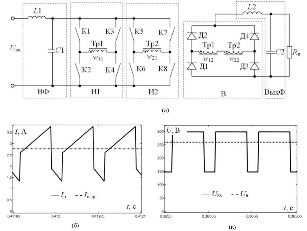 На рис. 1а приведена упрощенная схема предлагаемого конвертора в составе входного фильтра (ВФ), нерегулируемого инвертора И1, регулируемого инвертора И2, выпрямителя (В), выходного фильтра (ВыхФ) и нагрузки Rн. Входной фильтр предназначен для устранения влияния конвертора на питающую сеть, а выходной — для обеспечения требуемого качества выходного напряжения. На рис. 1б, в показаны диаграммы тока на выходе входного фильтра (тока потребления инверторов И1 и И2) и напряжения на входе выходного фильтра (на выходе выпрямителя).