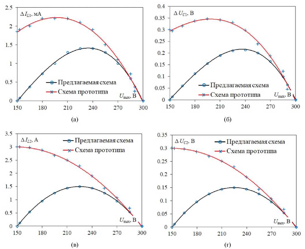 Критериями влияния воздействия данных факторов выбраны размах пульсаций тока дросселей и напряжения на конденсаторах входных и выходных фильтров. Результаты воздействия получены для схемы с неполным диапазоном регулирования выходного напряжения (далее — предложенная схема) в сравнении со схемой с полным диапазоном регулирования выходного напряжения (далее — схема прототипа).