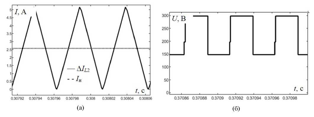 Рис. 3. Диаграммы пульсации тока дросселя L2 (а) и напряжения на входе выходного фильтра (б) в режиме прерывистых токов.